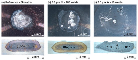 Degraded electrode working face and metallographic microsection of the weld joint: Reference (a), 3.0 µm Ni (b), and 2.5 µm W (c).