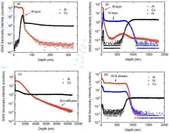 In addition to the EDX experiments, experiments with secondary ion mass spectrometry (SIMS) in the depth profile mode were carried out with a high spatial resolution in the nanometer range and a superior detection level of Al in the ppm range. As a model system, an AlMg3 tracer layer (70 nm) was deposited on a CuCr1Zr electrode without and with a Ni barrier layer of about 1 µm, using ion-beam sputtering. The corresponding SIMS profiles are shown in Figure 12a,b. The SIMS secondary intensity is a qualitative measure for the concentration of the respective element. The Al and Ni layers are clearly visible. The temporary increases in the Cu and Ni signals at the interface are artefacts due to the change of the ionization probability at the interface and, therefore, can be neglected. The samples were then annealed isothermally at 600 °C for 5130 s (~1.5 h). The time period was chosen so that there was sufficient duration for interdiffusion in the CuCr1Zr base material for the tracers used. It can be seen that for the samples without a barrier layer, the Al initially located at the surface diffuses deep into the sample during annealing up to 1 µm (Figure 12c). However, the sample with a Ni barrier layer shows unchanged stability at 600 °C and complete prevention of Al diffusion into the Cu (Figure 12d), which is in agreement with the EDX results. The strong increase in the Al signal within the region of the Ni layer, and the expansion of the layer thickness, can be explained here by the formation of Ni-Al intermetallic phases. Such phases generally show very low metal diffusion coefficients. Possible candidates are the NiAl or Ni3Al phases, with diffusion coefficients of only 10–20 respectively 10–22 m2/s at 600 °C [35,36]. This corresponds to maximum diffusion lengths of only 10 nm for the given annealing time, meaning that Al cannot cross the barrier. Cu(Al) and intermetallic CuAl phases show significantly faster diffusion [37]. The fact that the EDX measurements see no significant concentration of Al in the Ni layer might be due to the limited detection sensitivity of this method, of some single at.-%, which would indicate a Ni layer with a low Al concentration. Otherwise, the contradictory results are unexplained at the moment and need further clarification in the future. Note that diffusion in pure Ni is also relatively slow (10–19 m2/s at 600 °C) [38] and, as such, could explain the working of the barrier coating.