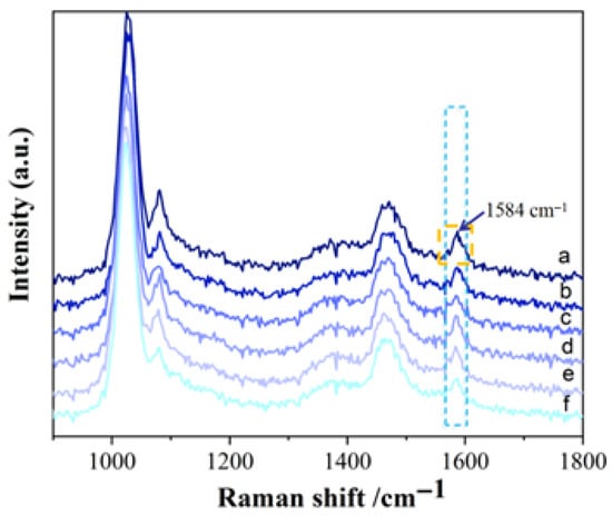 Surface plasmon resonance is the primary contributor to Raman signal enhancement. These “hot spots” in plasmonic nanostructures account for the majority of the overall SERS signal. Non-plasmonic micro/nanostructures can not only act as plasmonic enhancers, but also reduce energy loss and improve Raman efficiency [,]. Due to the enhanced electric field around the particles, the incident light’s electric field is amplified, leading to intensified Raman scattering. Different mixing orders result in distinct enhancement systems and varying enhancement effects. SERS measurements were performed using different mixing sequences, and the results are shown in Figure 4. The mixing order of C-AgNPs + NaCl + Hexaconazole yielded the highest peak area at 1584 cm−1 and was therefore selected for subsequent experiments.
