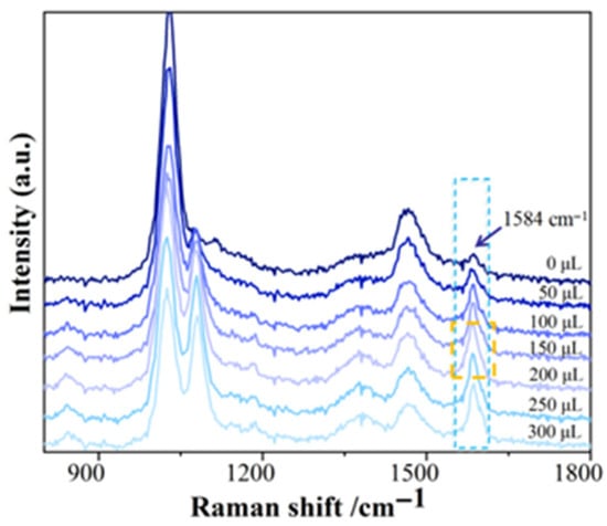 Following the optimal mixing sequence, 400 μL of C-AgNP solution, different volumes of 1 mol/L NaCl solution (0–300 μL), and 225 μL of 10 mg/L hexaconazole standard solution were successively added. The mixture was homogenized, allowed to stand for 5 min, diluted to 1 mL with methanol, and then subjected to SERS intensity measurement. The results are shown in Figure 6. The peak area at 1584 cm−1 reached its maximum when 200 μL of NaCl solution was used, compared to other volumes. Therefore, 200 μL of NaCl solution was selected as the optimal volume.