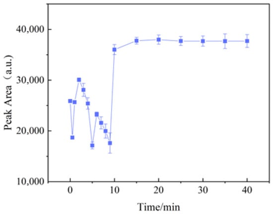 Following the optimal mixing sequence and the predetermined optimal volumes of solutions, 400 μL of C-AgNP solution, 200 μL of 1 mol/L NaCl solution, and 225 μL of 10 mg/L hexaconazole standard solution were sequentially transferred into a centrifuge tube. The mixture was diluted to 1 mL with methanol and measured at different reaction times to evaluate the effect on SERS intensity, each solution was measured three times. The results are shown in Figure 7.