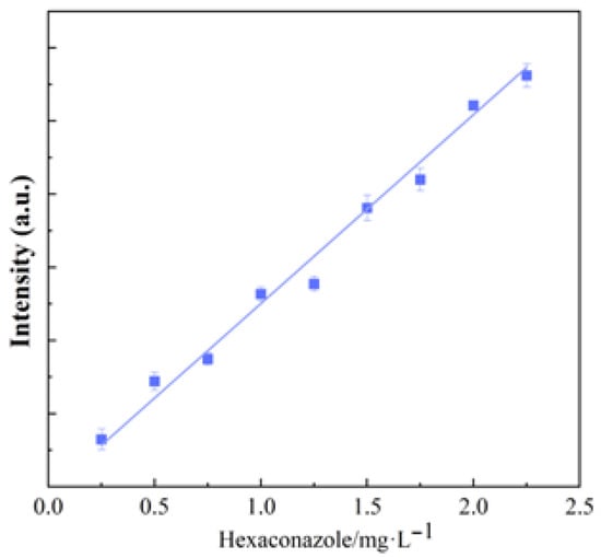 A series of hexaconazole standard solutions at different concentrations was prepared and their SERS intensities were measured under optimal conditions to construct a calibration curve, and each solution was measured three times. The results demonstrated a good linear relationship between the SERS intensity (ISERS) and the concentration (C) of hexaconazole in the range of 0.25–2.25 mg/L, with the regression equation expressed as ISERS = 51,671.35 C + 38,408.91 (R2 = 0.9870) (shown as Figure 8), and the lowest detection limit (LOD) of hexaconazole was 0.072 mg/L (3σ/k, where σ is the standard deviation of the blank sample and k is the slope of the standard curve).