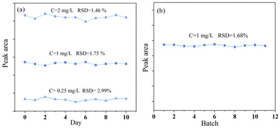 (a) The inter-day precision was assessed by analyzing reference solutions at three different concentrations of 0.25, 1, and 2 mg/L (n = 3). (b) The precision of the system was assessed by analyzing a reference solution with a concentration of 1 mg/L 11 times.