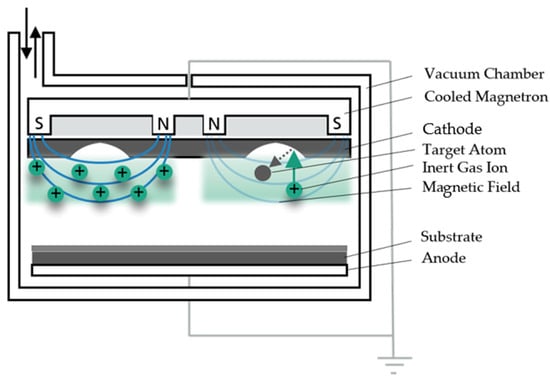 Thin metallic lithium films can also be produced by vacuum deposition. PVD processes are suitable for this purpose. Layer deposition in a vacuum is advantageous in terms of precisely creating the required thin layer thickness [9]. Cathode sputtering as a Physical Vapour Deposition process describes the atomic erosion of surfaces, which is caused by the bombardment of sufficiently energetic ions or atoms. The process takes place in a vacuum chamber [13,14].