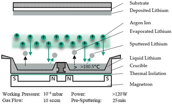MS deposition rates are limited, ranging between 1 and 10 nm s−1 depending on the given parameters and materials. To deposit several microns of material, the resulting process time is only suitable for certain industrial applications. By heating up the target, deposition rates can be increased by local evaporation processes and reduced sublimation energy on the target surface. For low melting point materials, deposition rates can be further enhanced by increasing the simultaneous evaporation through a target in a liquid state. Deposition rates of 10–100 nm s−1 can be achieved, significantly extending the applicability of the method to thick films and larger scales. In conventional MS, the cathode, the sputter target and the permanent magnets are cooled during the process. In Hot Target Sputtering (HTS), the sputter target is thermally isolated from the cooled magnetron. The energy introduced into the target during the process is barely dissipated, resulting in a rising target temperature and subsequently a liquid target for materials with a low melting point, such as lithium (180.5 °C). A liquid target requires a sputter-up process, as shown in Figure 2, where the target is placed under the substrate to prevent the dripping of the molten metal. The crucible containing the liquid target material must have a respective high melting temperature and the target material must be insoluble in the crucible material. Working with hot targets is not entirely new—several published papers show the effect of a hot target, for example, on the deposition rate of magnetron sputtering systems. Sasaki and Koyama compared the MS process of a liquid and a solid tin target and achieved a three times higher deposition rate by Hot Target Sputtering [15]. For example, Coventry et al. demonstrate sputtering Sn from a liquid phase and show the temperature dependence using He and D as precursor gases [16]. Makarova et al. and Bleykher et al. show the high-rate deposition of copper (melting temperature of 108.5 °C) by MS from a liquid phase with an increased particle flux of 10 times and more [17]. The resulting values of the coating in terms of adhesion and hardness have been superior to conventional sputtering. Building on this, they have investigated the thermal processes and the atomic emission of MS from a liquid phase with copper targets in several publications [18,19,20,21,22]. Yuryeva et al. have demonstrated copper deposition rates of 200 nm/s, which exceed the conventional sputtering rates by a factor of twenty. They also investigate the effect of the crucible material on the operation of the liquid copper target sputtering process [23].