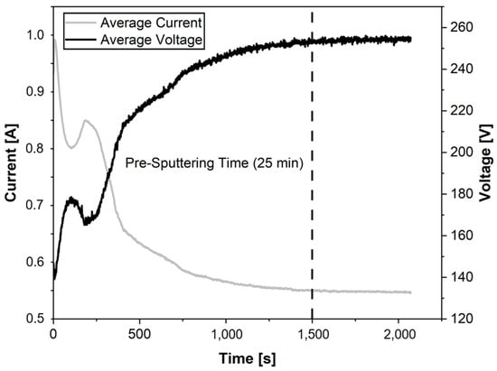 As part of further experimental investigations towards process stabilization, sputtering processes with a duration of 45 min were carried out. The current and voltage curves during the process are plotted in Figure 4. The curves are horizontally mirrored because the sputtering process takes place at constant power (135 W). At the start of the process, a high current and therefore a low voltage is applied to the target. This initially drops before reaching a local minimum after a sputtering time of about 200 s. The current then rises again until it reaches a local minimum. The current then increases again until a local maximum is reached after a coating time of about 250 s. From this point on, the current intensity decreases. This process is similar to a negative exponential growth. This behaviour is mirrored horizontally for the voltage curve, since the power supply is operated in constant power mode; therefore, the average voltage and current are not manually controlled but automatically adjust during the process to maintain the set power. From a sputtering time of about 1500 s (25 min), the current and voltage curves change only slightly. From this point on, both curves are approximately parallel. The average current in this range is about 540 mA, while the average voltage reaches a value of about 250 V. The high currents and low voltages at the beginning of the process indicate a passivation layer on the target surface, since, instead of target atoms, more secondary electrons are released from the target surface, thus increasing the number of electrons within the applied electric field. As the process starts, the ceramic passivation is removed atom by atom. This causes the current to decrease as fewer secondary electrons are released from the target. On this basis, the time for pre-sputtering the target is set at 25 min for the further experiments, as a constant behaviour of the current and voltage can be seen from 1500 s onwards. It can be assumed that the sputtering process is stable from this point on.