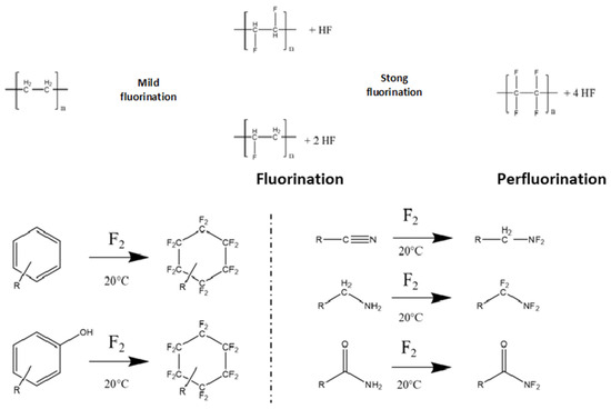 Fluorination mechanisms of polyethylene and different chemical groups present in polymers (according to [67]).