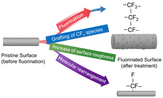Plasma treatments represent highly effective techniques for modifying the surface properties of various materials, especially natural fibers. Among fluorinated plasmas, those generated from gases such as SF6, CF4, CHF3, C2F6, C3F6, and C4F8 are predominantly used. These plasmas were initially developed for etching processes in microelectronics but have since been applied for surface treatments aimed at altering the reflectance or wettability of different materials [73]. When applied to natural fibers, four main reaction mechanisms typically occur, with their relative importance depending on treatment parameters such as discharge type, reaction time, gas pressure, and applied power [74]. The reactions are schematized in Figure 3. First, there is the functionalization of the surface through the incorporation of fluorine atoms (fluorination), mainly via reactions with hydroxyl groups. Second, the deposition of fluorinated groups such as CFx, CHxFy, or SFx takes place on the material surface. Third, surface roughness is created or modified by controlled or incidental etching. Finally, the surface is stabilized through rearrangement reactions of excited molecules (AB + CD → AC + BD) [75], including those on the fiber surface.