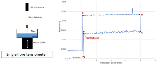Single fiber methodology: schematic description of the setup for a single fiber (left)—example of recorded force by the microbalance (right)—before point A, recording of a drift before contact between fiber and test liquid; between B and C, advancing stage; between D and E, receding stage [87].