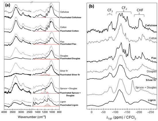 To investigate how the chemical composition of wood affects fluorination, Pouzet et al. [91] selected seven lignocellulosic substrates—cellulose, lignin, cotton, flax fibers, fir (Abies sp.), Douglas fir (Pseudotsuga menziesii), and a spruce–Douglas mix. After degassing (1 h at 90 °C under ~10−3 mbar vacuum), these samples were statically exposed to 20 mbar pure F2 in a closed, passivated nickel reactor. FT-IR analysis (Figure 5a) of raw and treated samples showed new peaks at 1080, 1160, 1200, and 1280 cm−1—indicative of covalent C–F bond formation—and a reduction in the hydroxyl (–OH) band at 3000–3500 cm−1, confirming the substitution of C–OH with C–F groups, which reduce water affinity. 19F magic-angle-spinning NMR (Figure 5b) identified three fluorinated species: –CHF (−180 to −220 ppm), –CF2 (−100 to −160 ppm, indicating perfluoration), and –CF3 (−70 to −90 ppm, linked to chain scission via hyperfluoration) [92,93,94,95], thus confirming surface fluorine grafting by both FT-IR and NMR.