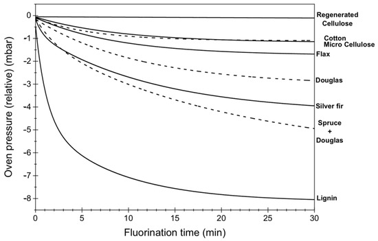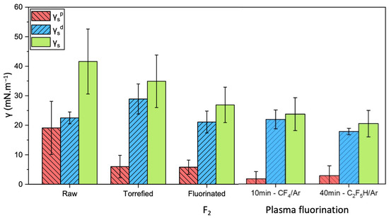 As expected, fluorination reduced surface polarity by lowering the polar component of surface tension [96,97]. Contact angle measurements (Table 1) showed a significant increase in hydrophobicity for fluorinated lignocellulosic materials (though not for purely cellulosic ones like cotton or cellulose).