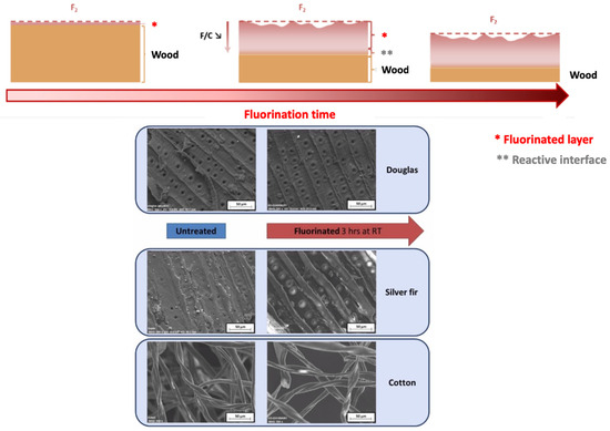 Furthermore, fluorinated wood samples subjected to 800 min at 30% and 60% relative humidity showed markedly lower moisture uptake compared to untreated samples, confirming enhanced water repellency [98]. Cellulosic materials resist fluorination more than lignocellulosic ones due to compositional differences. Wood is mainly composed of three primary components: cellulose, hemicellulose, and lignin. Cellulose typically accounts for 40–50% of the dry weight of wood. Hemicellulose represents about 20–30%, depending on the wood species. Lignin makes up approximately 20–30%. These relative proportions can vary depending on factors such as wood species (hardwood vs. softwood), age, and environmental growth conditions. Real-time pressure drops during static fluorination revealed the reactivity order: lignin > wood flour > fir > Douglas fir > flax > cotton > cellulose (Figure 6). This shows that lignin content correlates positively with fluorine reactivity, while cellulose inhibits the reaction [98]. FT-IR data (Figure 5a) support this, as greater –OH reduction is seen in lignin-rich fibers. Belov et al. [99] fluorinated acetyl-cellulose and ethyl-cellulose in perfluordecalin: 13C NMR showed negligible change compared to fluorinated cellulose, while 19F NMR indicated fluorination only on methyl and ethyl groups, not the glycopyranosyl rings—further confirming cellulose’s resistance. Thus, direct surface fluorination can substitute C–OH with C–F bonds—imparting hydrophobicity without altering bulk mechanical integrity. Indeed, lignocellulosic’s mechanical performance is mainly induced by cellulose [100] and therefore its low reactivity towards fluorination will prevent mechanical loss. Structurally, fluorination preferentially modifies outer wall layers (e.g., middle lamella, primary wall) rich in lignin while preserving the cellulose-dense S2 layer responsible for fiber rigidity and consolidates mechanical properties better than torrefaction, which sacrifices strength for hydrophobicity [44]. Extended fluorination can degrade carbon skeletons, indicated by CF3 formation [96,97,101]. However, 19F-NMR and SEM (Figure 7) analyses reported by Pouzet et al. [102] showed no significant CF3 or surface degradation after a 3 h treatment at ambient temperature, suggesting controlled fluorination can avoid damage. Finally, Pouzet [102] identified a saturation point: prolonged dynamic fluorination in open systems results in more –OH being removed than C–F bonds formed (offset by CF4 and C2F6 formation), leading to substrate deterioration and reduced hydrophobic and mechanical performance.