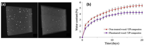 (a) Three-dimensional reconstruction of untreated polyester–wood composite samples (left) and fluorinated polyester–wood composite samples (right) after X-ray tomography scanning [117]; (b) evolution of water absorption in composites made from fluorinated or non-fluorinated wood flour [112].