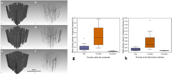 Three-dimensional reconstruction and visualization of fibers and micrometric pores for raw ((a) and (b), respectively), torrefied ((c) and (d), respectively) and fluorinated ((e) and (f), respectively) flax fibers reinforcing the epoxy resin; porosity rate (g) within the composite and (h) at the fiber/matrix interface; composite with epoxy resin [104].