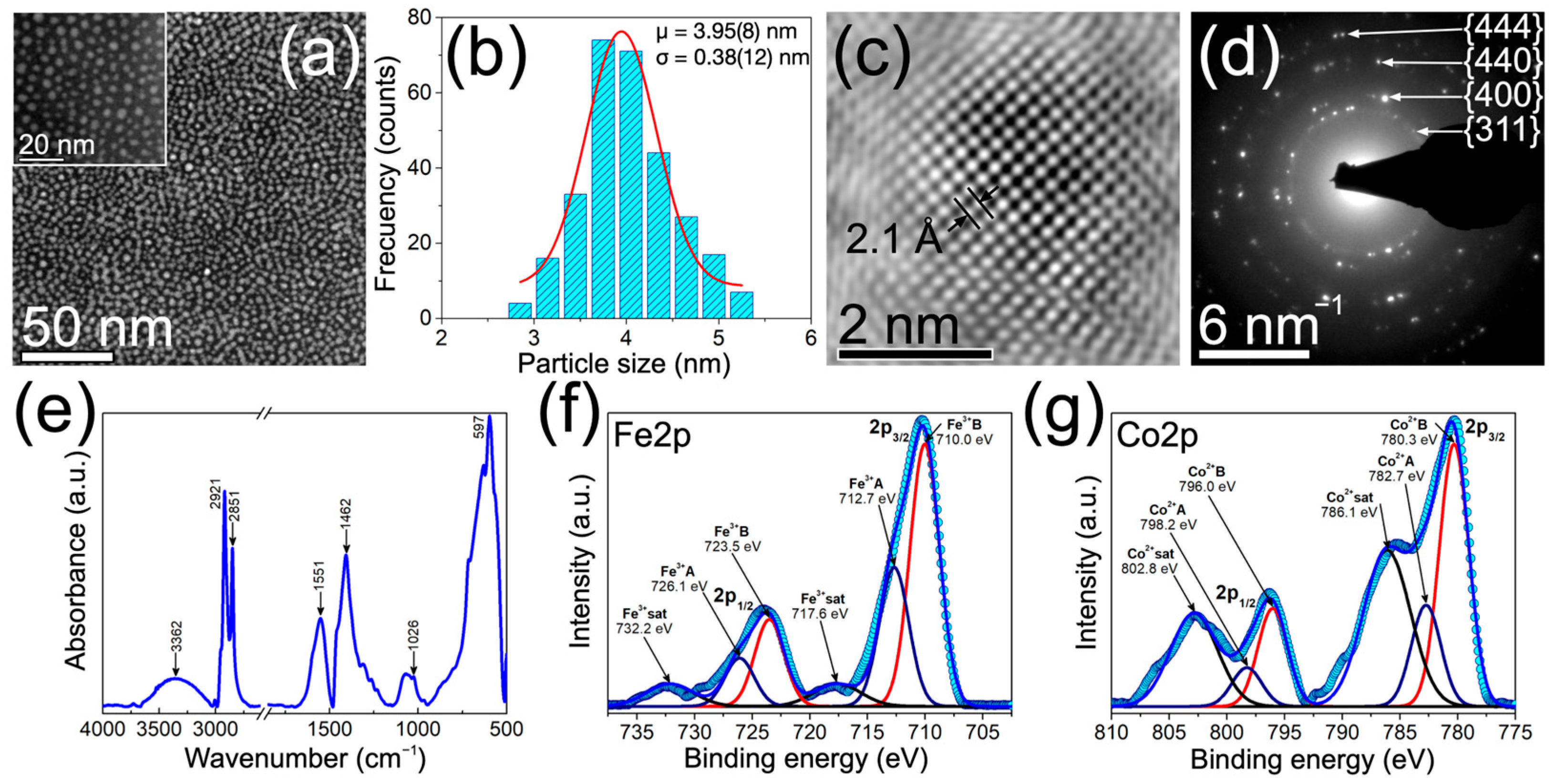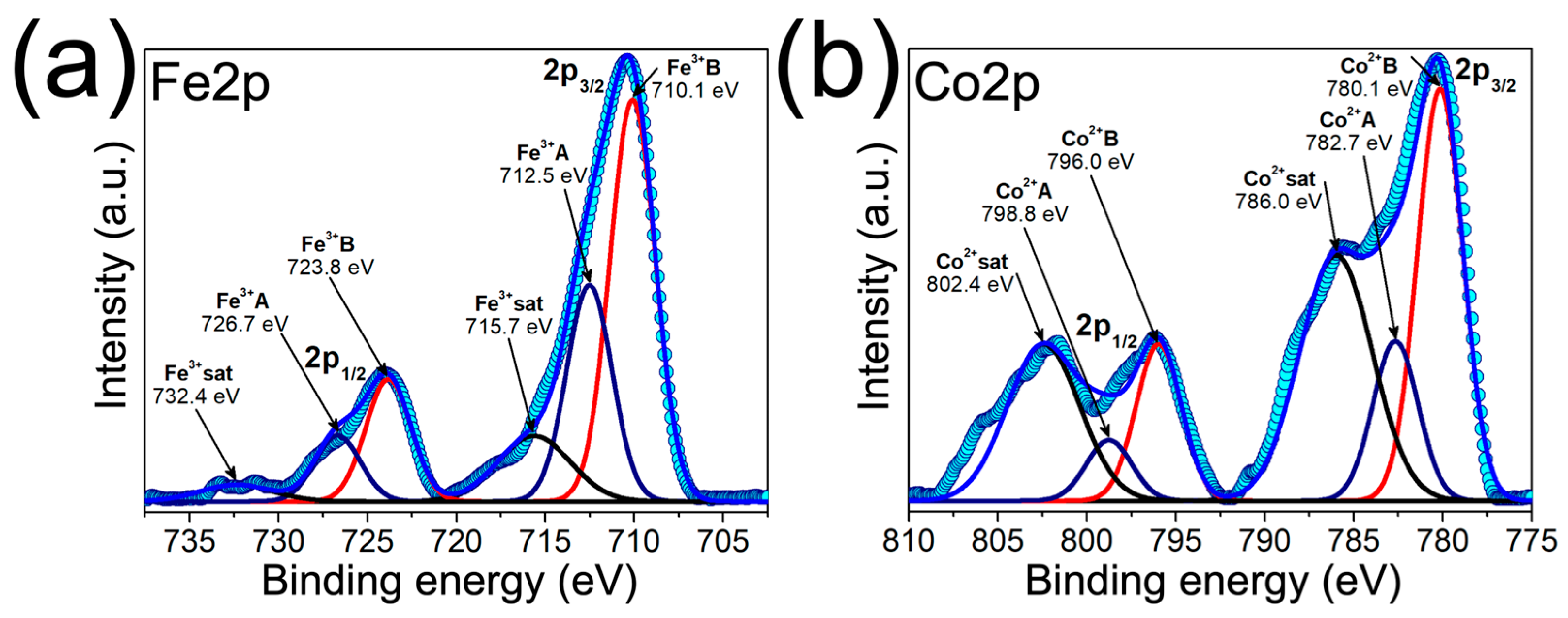 - Mosiniewicz-Szablewska, E.; Figueiredo, L.C.; da Silva, A.O.; Sousa, M.H.; Morais, P.C. Magnetic studies of ultrafine CoFe2O4 nanoparticles with different molecular surface coatings. Phys. Chem. Chem. Phys. 2024, 26, 3296–3314. [Google Scholar] [CrossRef]