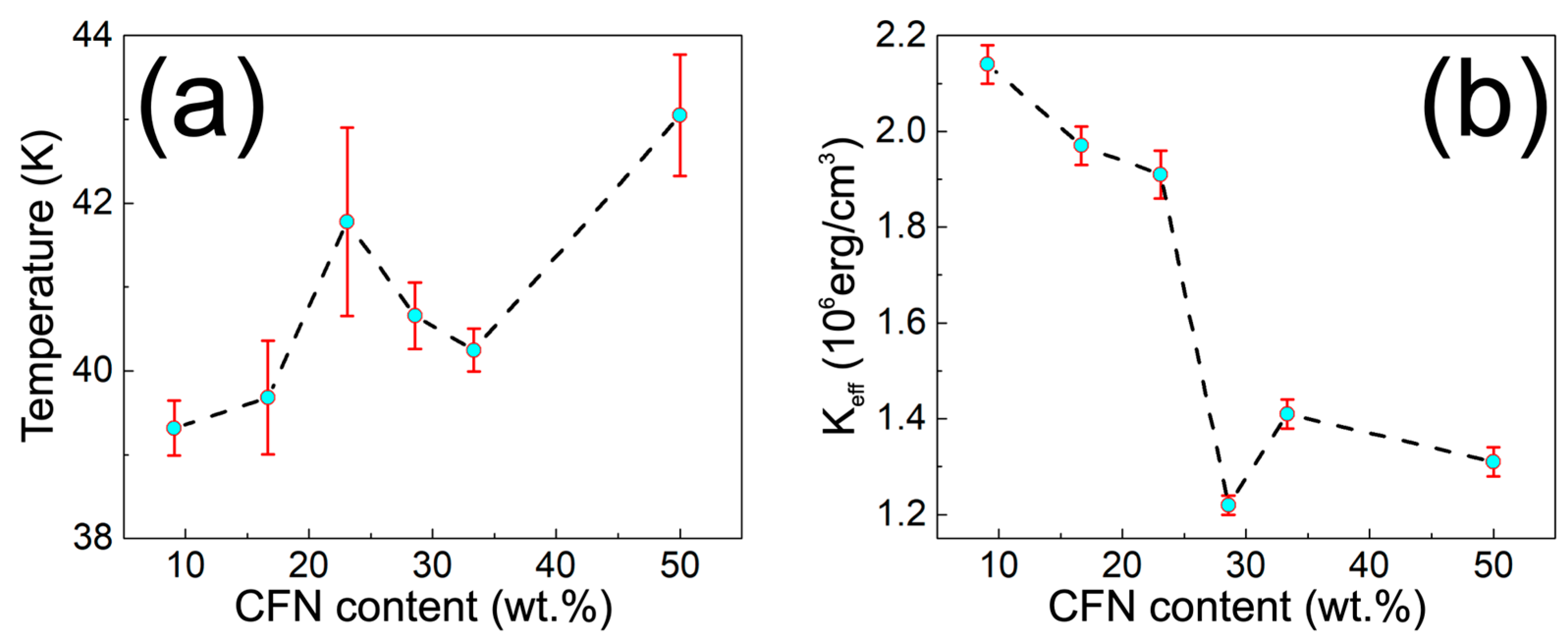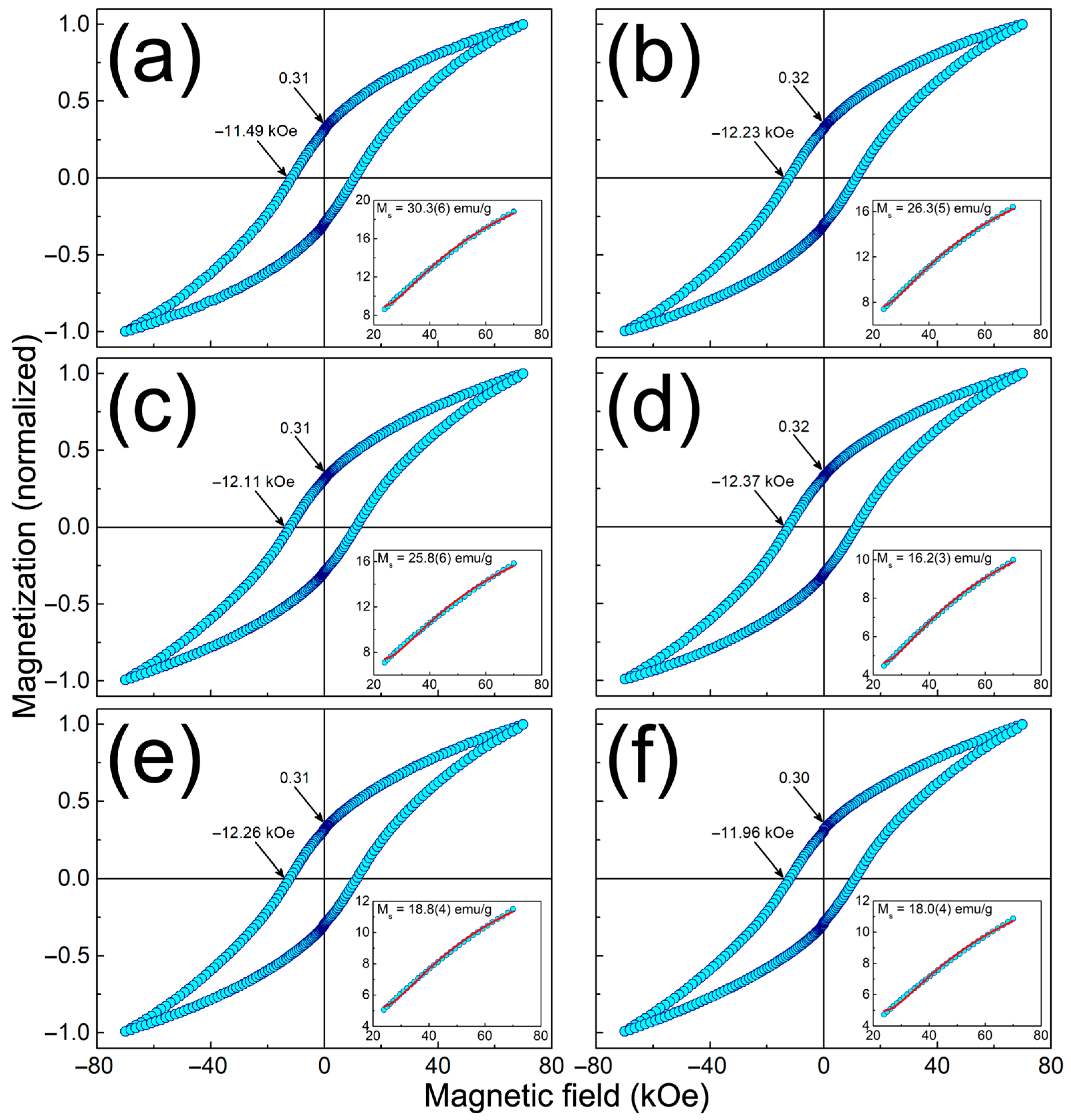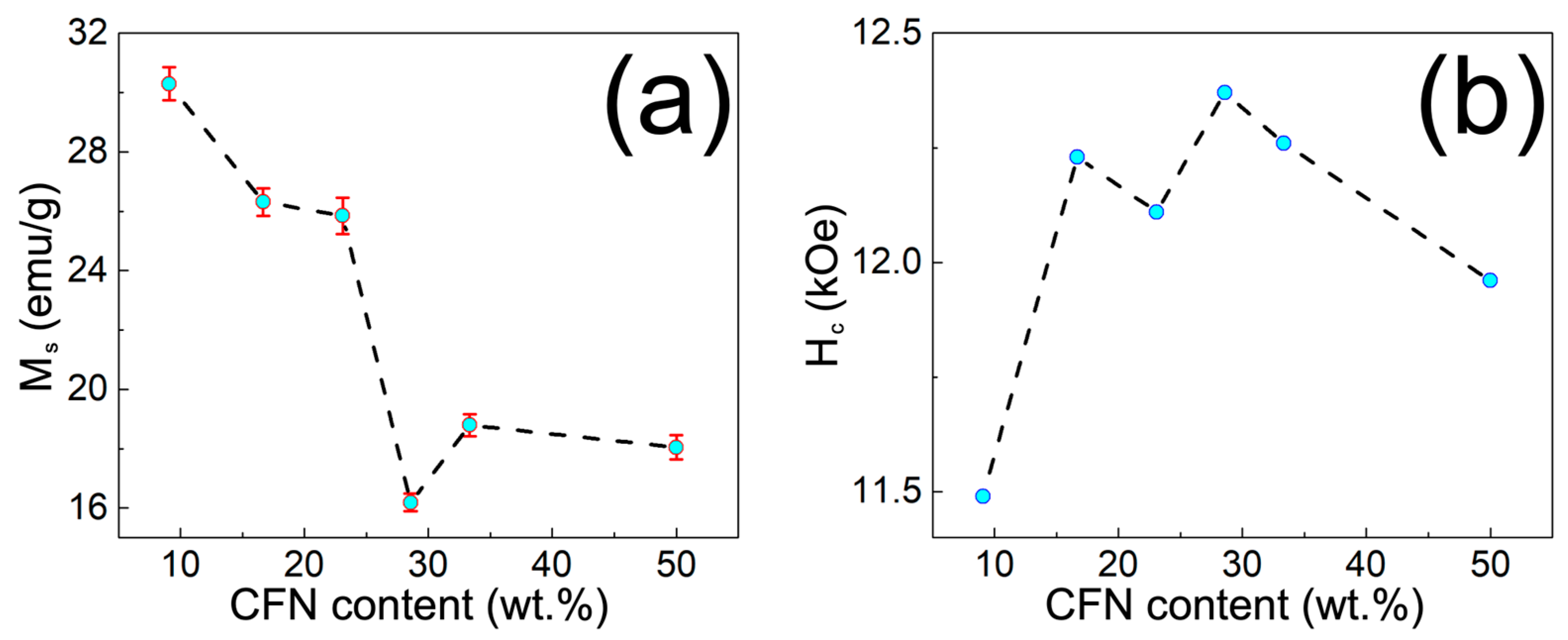 - Sanna Angotzi, M.; Mameli, V.; Zákutná, D.; Kubániová, D.; Cara, C.; Cannas, C. Evolution of the magnetic and structural properties with the chemical composition in oleate-capped MnxCo1–xFe2O4 nanoparticles. J. Phys. Chem. C 2021, 125, 20626–20638. [Google Scholar] [CrossRef]