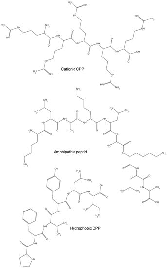 Representative structures of the three classes of CPPs: polyarginine (as cationic prototype, RRRRR), amphipathic (i.e., KLAKLAKLA) and hydrophobic (i.e., PFVYLI).