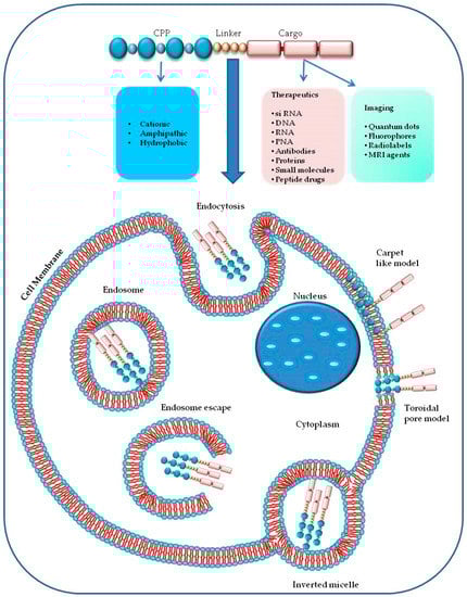 Schematic representation of several cargo types delivered by CPPs and of cellular uptake mechanisms including endocytosis (clathrin mediated endocytosis, caveolae mediated endocytosis, clathrin/caveolae indipendent) and direct traslocation (carpet like model, toroidal pore model).