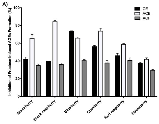 In the fructose-induced AGEs formation assay (Figure 1A), at a concentration of 100 μg/mL, the berry ACEs showed the most potent anti-glycation effects followed by their corresponding CEs and ACFs. Among all of the berry ACEs, black raspberry showed the highest inhibitory effects (85.4%), followed by cranberry (74.5%), blueberry (66.7%), blackberry (66.1%), red raspberry (59.1%), and strawberry (42.8%). In the MGO-induced AGEs formation assay, at the same concentration (100 μg/mL), only the ACEs from black raspberry, blueberry, blackberry, and cranberry showed moderate inhibitory effects of 40.5%, 29.2%, 27.7%, and 25.4%, respectively. Therefore, a higher concentration (500 μg/mL) of these extracts was selected for further evaluation. As shown in Figure 1B, at this higher concentration, the berry ACEs showed the highest inhibitory effects ranging from 42.3–74.6%, followed by their respective CEs and ACFs. Among the ACEs, the most potent anti-glycation effects were from black raspberry (74.8%), blueberry (72.4%) and blackberry (72.2%). The other berry ACEs showed anti-glycation effects ranging from 42.4–51.7% inhibition.