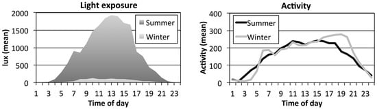 Seasonal differences in light exposure were observed during the brightest 10 h (MB10) and the least bright 5 h (LB5). The illuminance was always higher during summer when compared to winter periods for both MB10 and LB5 (p < 0.0001, t-test; see Table 3). The onset of LB5 was about one hour later in summer.