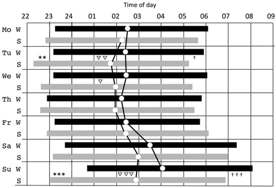 Mean sleep periods during the week (onset, offset, mid-sleep (circle dot)) during the week for winter (W, black bar) and summer (S, grey bar) with symbols marking seasonal differences between means for onset (*), mid-sleep (▽) and offset (†), (▽, † = p < 0.5; **, ▽▽ = p < 0.01; ***, ▽▽▽, ††† = p < 0.001).