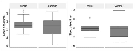 Box-plot of sleep onset (bottom left) and offset (bottom right) during workdays in winter and summer. The borders of the boxes represent the 25th (Q1) and 75th (Q3) quartiles, respectively. The boxes represent the interquartile range (IQR = Q3 - Q1). Whiskers are calculated as Q3 + (1.5 × IQR) and Q1 − (1.5 × IQR). Outliers outside that range are marked with dots in the figure.