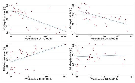 Scatter plot for day workers of mid-sleep hours (y-axis, time of day) against total light exposure (x-axis, median lux/h) during the morning hours (04–10:00 h) and fitted values in summer (upper left) and winter (upper right). Mid-sleep hours and light exposure during evening/night hours (18–04:00 h) in summer (lower left) and winter (lower right).