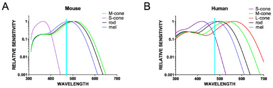 Relative sensitivity curves for all of the opsins present in the mouse (A) and human (B) retina. Note the limitation of using blue light (~470 nm) to excite melanopsin only (λmax~480 nm); although there is significant overlap with the melanopsin peak sensitivity, this light also excites other photoreceptors to different extents.