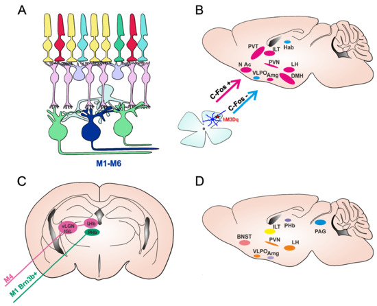 ipRGC pathways for mood regulation in mice. (A) Schematic presentation of mammalian retina, with six subtypes of ipRGCs (M1–M6). (B) Brain areas involved in the regulation of mood and behavioral state were shown to have increased activity (measured upregulation of c-Fos, an early marker of neural activation) following the acute activation of ipRGCs using chemogenetics (ipRGCs expressing Gq-coupled chemogenetic hM3Dq receptor, depicted by a red star), in pink. Nuclei labelled in blue showed no c-Fos increase. Figure adapted from [63]. (C) Two identified pathways by which ipRGCs are involved in light-induced regulation of depressive-like behavior. The M1 Brn3b+ ipRGCs project directly to PHb (perihabenular nucleus) and are involved in depressive-like behaviors in mice triggered by chronic aberrant light exposure (T7 cycle). M4 ipRGCs innervate the vLGN/IGL-LHb (ventral lateral geniculate nucleus/intergeniculate leaflet-lateral habenula) pathway and are responsible for short-term light effects in decreasing depressive-like behavior. (D) Nuclei involved in the regulation of mood and behavioral state that receive direct projections from ipRGCs. Paraventrical hypothalamic nucleus (PVN), the dorsomedial hypothalamus (DMH), lateral hypothalamus (LH), ventrolateral preoptic nucleus (VLPO); amygdala (Amg), intralaminar thalamic nuclei (ITL), paraventricular thalamus (PVT), lateral habenula (LHb), nucleus accumbens (NAc), Bed nucleus of the stria terminalis (BNST) and periaqueductal gray (PAG).