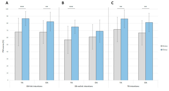 Effect of 12-h retention intervals filled with either daytime wakefulness or sleep on the recall of EB-link, EB-nolink and TB intentions (expressed as mean performance ± standard error of the mean (SEM)) in young and older adults (YA and OA, respectively). **: p < 0.01; ***: p < 0.001.