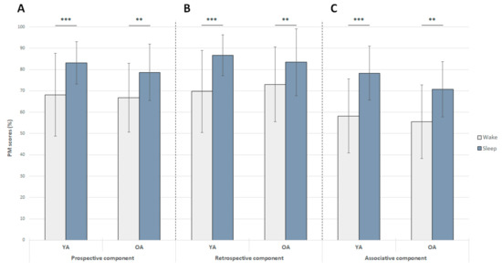 Effect of 12-h retention intervals filled with either daytime wakefulness or sleep on the recall of the prospective, retrospective, and associative components of intentions (expressed as mean performance ± standard error of the mean (SEM)) in young and older adults (YA and OA respectively). **: p < 0.01; ***: p < 0.001.
