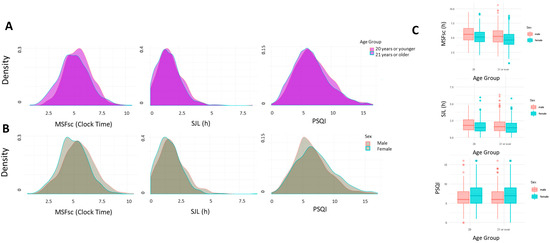 Density plots showing the distribution of MSFsc, SJL and PSQI scores in (A) participants 20 years old or younger, and those of 21 years or older and (B) males and females. (C) Box plots showing the main effects of sex and age on MSFsc and SJL, and sex on PSQI, but no age group and sex interactions effects on MSFsc, SJL or PSQI.