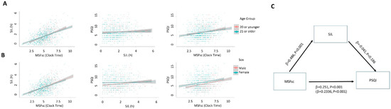Scatterplots showing the associations between MSFsc, SJL and PSQI (A) in younger and older participants and (B) in males and females. (C) Mediation analysis of the relationship between MSFsc and PSQI by SJL.
