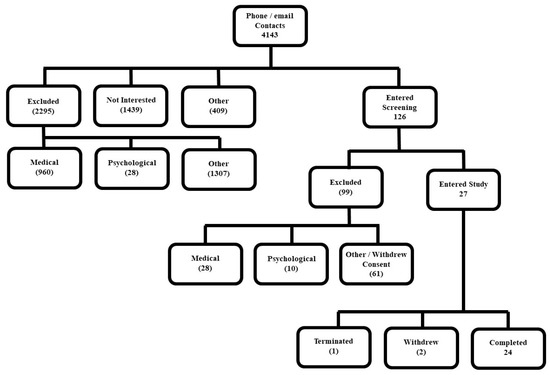 If a participant is disqualified during the clinical interview, or because of high scores on the three screening questionnaires taken at the time of the interview, they are told immediately, with the reason explained in detail. Regardless of when in the process the exclusion occurs (see Table 5), the psychologist will advise them about follow-up treatment, if warranted, and provide information about where they might get assistance.