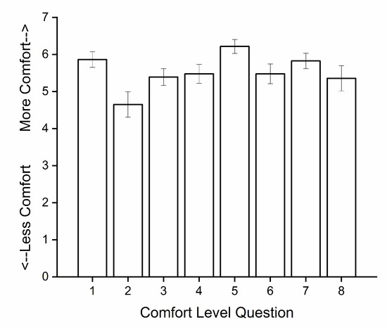 Subjective comfort level of study conditions evaluated at end of study. Each bar represents the mean and standard error of evaluations on one comfort level question from 23 of the 24 participants. Responses were rated on a 1 to 7 scale where 1 was “extremely bad” comfort level and 7 was “extremely good” comfort level. The comfort level categories shown on the x-axis are: 1: IV catheter, 2: core temperature sensor, 3: scalp electrodes, 4: face electrodes, 5: wrist activity monitor, 6: test frequency, 7: test duration, and 8: constant Posture condition.