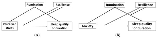 When complex relationships like those between perceived stress, anxiety, sleep, rumination, and resilience need to be explored, mediation and moderation analyses are useful statistical tools. Mediation analysis models a relational sequence of one independent variable to a mediating variable (mediator) and then the mediating variable to the dependent (outcome) variable []. Moderation analysis examines the strength of the relationship between two variables under different values of a moderating variable (moderator) []. Given the complex relationships between stress, anxiety, stress response styles, and sleep behaviors [,,,,,,,,,,,,], multiple mediation and moderation analysis models were proposed to examine relationships between perceived stress and anxiety on sleep under the mediation of rumination and the moderation of resilience.