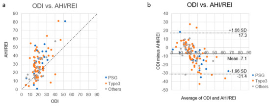 Oxygen desaturation index (ODI) obtained in the Nagahama Study versus apnea-hypopnea index (AHI), analyzed by polysomnography (PSG), and respiratory event index (REI), analyzed by out-of-center sleep testing (OCST) obtained in the clinical setting. (a) A scatter plot and (b) a Bland–Altman plot were generated to compare ODI and AHI/REI. Blue dots represent AHI from polysomnography (PSG), orange dots represent REI from type 3 OCST (Type 3), and gray dots represent REI from 2–3 channel OCST (Others).
