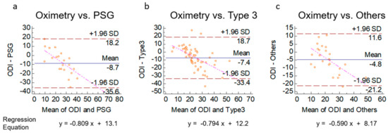 The slopes of the regression equations of the Bland–Altman plots (Figure 3) suggested similarities in the agreement of the clinical sleep tests, especially between PSG and type 3 OCST. The slope comparing oximetry and type 3 OCST (Figure 3b) was −0.794, which was between −0.809 (Figure 3a: oximetry vs. PSG) and −0.590 (Figure 3c: PSG vs. others). We did not directly compare PSG and OCST in the same patients in this study; however, the slope data suggested that increasing the number of monitoring channels from two or three in “Others” to four (as in the type 3 OCST) may provide more accurate data that is similar to PSG, the gold-standard test [9,26].