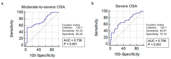 The area under the ROC curve (AUC) serves as an overall measure of a diagnostic test’s accuracy. The AUC values suggested that ODI offered a moderate level of accuracy to detect both moderate-to-severe (0.736) and severe (0.708) OSA (Figure 4a,b). The Youden index was used to calculate the optimal ODI thresholds to detect moderate-to-severe OSA (ODI > 20.1) and severe OSA (ODI > 20.1).
