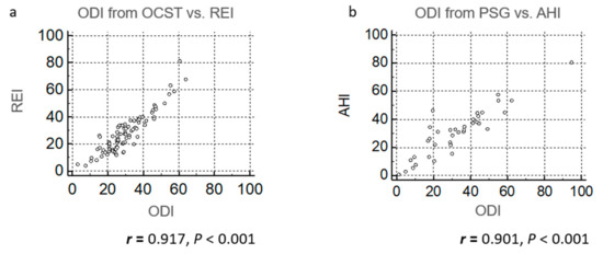 The differences in the correlation coefficients between our data (r = 0.561, p < 0.001) (Figure 2a) and Matsumoto et al. (r = 0.99, p < 0.001) [25] may be due to differences in settings. Our data compared previously performed oximetry with PSG or OCST that was performed later in a clinical setting. Matsumoto et al. compared ODI with AHI from simultaneously recorded data.