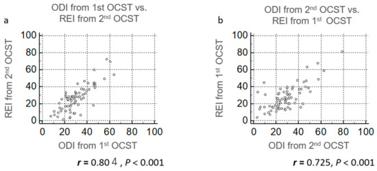 Scatter plots of oxygen desaturation index (ODI) vs. respiratory event index (REI) analyzed with out-of-center sleep testing (OCST) from different recordings. Two nights of OCST were performed. (a) ODI from the first night was compared with the REI from the second night and (b) ODI from the second night was compared with REI from the first night.