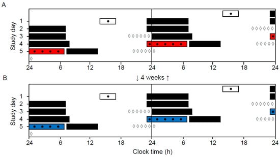 Double-raster plot of the simulated night shift protocol. The protocol included two simulated night shifts (from 23:00 to 06:45 h) performed in a laboratory with long-wavelength narrow-bandwidth light (A) and short-wavelength narrow-bandwidth light (B). The night shifts were separated by 4 weeks and the order of conditions was counterbalanced. White bars indicate enrollment and practice session (before the first night shift only) in the laboratory. Black bars indicate assumed sleep periods at home. Colored bars indicate night shifts in the laboratory. Black dots indicate primary test bouts including the Positive and Negative Affect Schedule (PANAS), the Karolinska Sleepiness Scale (KSS), a Psychomotor Vigilance Task (PVT), and a Digit Symbol Substitution Test (DSST). White diamonds indicate salivary dim-light melatonin sampling at home.