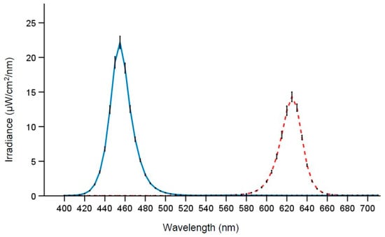 Spectral distribution of the short-wavelength narrow-bandwidth light (solid line) and the long-wavelength narrow-bandwidth light (dotted line). Means and SD (error bars) for measurements (vertical plane) at eye level.