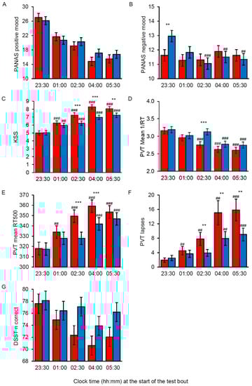 For the DSST n correct, there were main effects of Light with more correct responses in short-wavelength light, and Time with fewer correct responses at 02:30 (p = 0.018), 04:00 (p < 0.001) and 05:30 h (p = 0.002) compared to 23:30 h (Table 2). There was no significant Light by Time interaction effect for the DSST (Figure 3G).