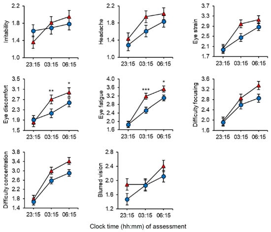 There were significant main effects of Light for all symptom categories, except irritability, with reduced symptoms in short-wavelength light (Table 2). For all categories there were significant main effects of Time with increased symptoms at 03:15 h (irritability: p = 0.032; blurred vision: p = 0.263; all other p < 0.001) and at 06:15 (p ≤ 0.001, all) compared to 23:15 h. For eye discomfort and eye fatigue, there were significant Light by Time interaction effects, and post-hoc comparisons showed reduced symptoms in short-wavelength light in the middle and late parts of the night shift (Figure 4). There were no significant Light by Time interaction effects for irritability, headache, eye strain, difficulty focusing, difficulty concentrating or blurred vision (Figure 4).