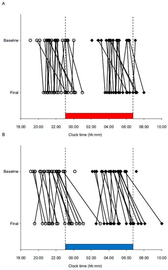 Phase markers for individual participants before (Baseline) and after (Final) a simulated night shift in (A) long-wavelength narrow-bandwidth light and (B) short-wavelength narrow-bandwidth light. Open circles indicate salivary dim light melatonin onset (DLMO) for each participant. Filled diamond squares indicate estimated temperature minimum (DLMO + 7 h) for each participant. Lines are drawn between the baseline and final markers for each participant. The vertical dotted lines and colored bars indicate the start and end times of the night shift and light exposure (23:00–06:45 h).