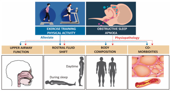 It has been shown that fluid that accumulated in the legs during the day (due to gravity and the diminution of the muscular pump activity when lying down at night) is redistributed rostrally [48]. This rostral redistribution during the night, especially towards the neck and thorax, may play a role in the pathogenesis of OSA [49]. The redistribution of fluid in the neck can increase pressure on the tissue surrounding the upper airway, reducing its size and increasing its collapsibility, which is a predisposition towards OSA [48]. Interventions that reduce fluid accumulation in the legs, such as diuretics and wearing compression stockings, can attenuate OSA [50,51]. On the other hand, the increase of sedentary patients’ physical activity level with OSA has been associated with a reduction in AHI, independent of body mass. This situation occurs concomitantly with a reduction in fluid shifting from the legs to the pharynx during the night [52] (Figure 1).