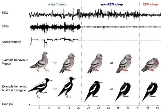 Birds can quickly transition between states of wakefulness, non-rapid eye movement (non-REM) sleep and REM sleep. When birds are awake, the electroencephalogram (EEG) is activated, muscle tone is typically high and variable (shown by the electromyogram or EMG), and the bird is often moving (shown by recordings of accelerometry or video). Non-REM sleep is characterized by slow (<4 Hz) large waves in the EEG, typically accompanied by relaxed skeletal musculature and quiescent behavior; many birds (including pigeons) can also have one or both eyes open. REM sleep is characterized by wake-like patterns in the EEG, often (but not always) relaxed skeletal musculature from the preceding non-REM sleep level, eye movements behind closed eyelids and behavioral restfulness. As illustrated by the example postures of pigeons and Australian magpies, behavior can give some insights into a bird’s state, but it can be difficult to distinguish between sleep states or even between sleep and wakefulness []. These EEG, EMG and accelerometry traces are representative examples recorded from an Australian magpie. Illustrations by Laura X. Tan.