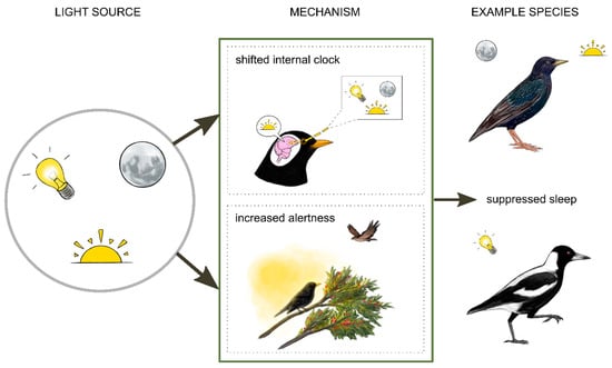 Exposure to light can suppress sleep in birds. European starlings sleep less in summer and during a full moon []. Australian magpies show disrupted sleep under artificial light at night []. There are two broad mechanisms by which these effects might occur. Light might influence sleep indirectly by shifting the timing of the circadian clock. In European blackbirds, increased activity at night during light exposure has been linked to reduced melatonin, a hormone important for regulating circadian timing []. Light might also directly increase alertness by masking natural light cues and facilitating foraging or vigilance []. Illustrations by Laura X. Tan.