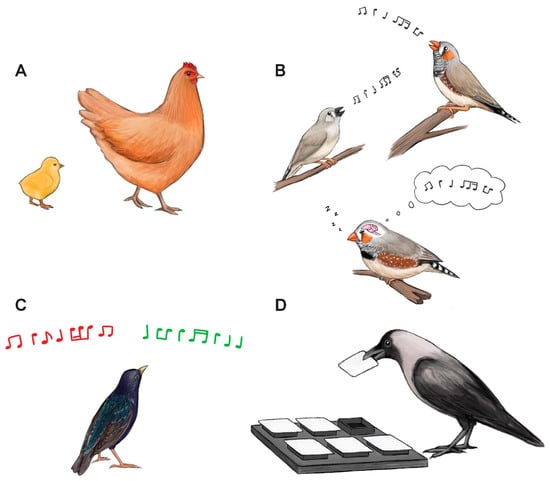 Multiple cognitive processes in birds depend on sleep, including: (A) imprinting in domestic chicks, (B) developmental song learning and neuronal replay in zebra finches, (C) auditory discrimination learning in European starlings and (D) spatial learning in Indian house crows. Illustrations by Laura X. Tan.